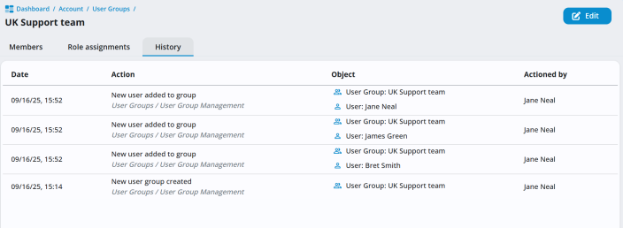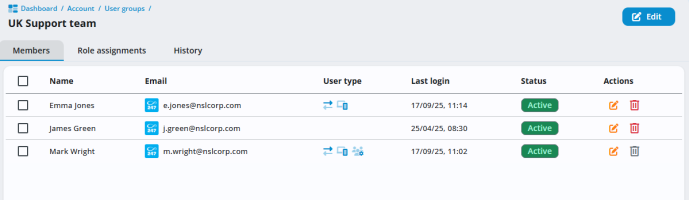 Displays the users in the group. You can edit or delete users from the group here. Clicking a user opens their user details page.