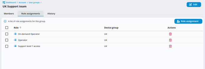 Shows the roles assigned to the group and the associated device group. If you delete the role, it also removes it from the device group.